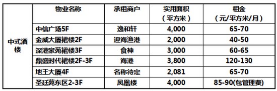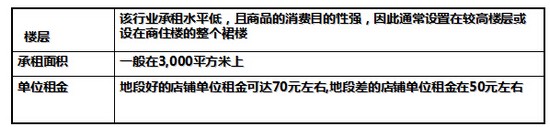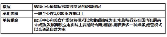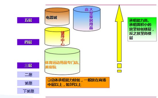 大型中式酒楼——承租水平低,要求面积大,但可提供消费者休憩、餐饮场所,是购物中心必要因素,一般放至最高楼层。