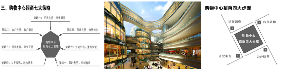 前期对租赁模式和招商模式不作固定而是做最优准备和多方面选择,全面了解掌握、收集重点目标客户信息加以资料整理,在后期根据实际情况再做阶段性调整。无论是何种租赁模式和招商模式皆然。在招商阶段中,可通过对不同时段的招商政策进行阶段性调整,加大市场张力,制造商户紧张感,促使其早日承租。保留部分好位置暂不推出,以备其他外地品牌或者谈判周期较长的好品牌进入,同时有利于解决不可预见的调整和纠纷。
