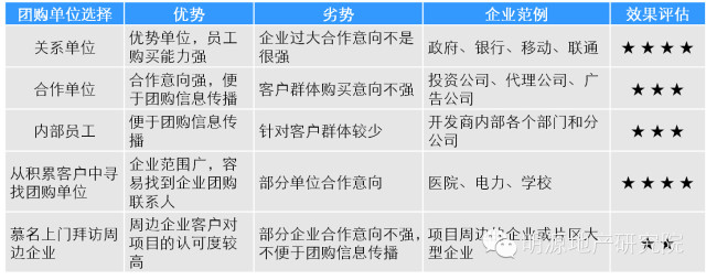 那如何找到这些团购效果突出的企业?可以从几个方式着手:第一,通过老业主挖掘团购群体,老业主由于以及购买过项目,一般对本项目会比较认可,所以找对应在这些单位的老业主;第二,如果是新开盘的项目,可以在已认筹的客户中联系其单位团购;第三;陌拜拓展团购单位,比如置业顾问直接去拜访中国移动、联通、医院这些企业,陌拜可先从项目周边企业开始。