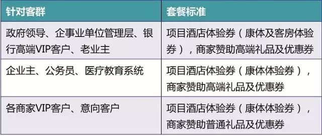 此外,除了房款优惠,还可以整合其他商家资源、项目配套资源,给予客户其他形式的优惠。比如碧桂园某项目制定的拓客套餐: