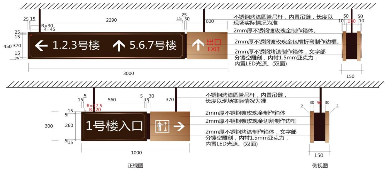 7.悬挂型标识底标高≥2200mm,粘挂型标识中心固定标高控制为1600mm;中英文字体的大小比例为3∶1;字体以标准中文黑体字为主,连续设置的间距为50m。