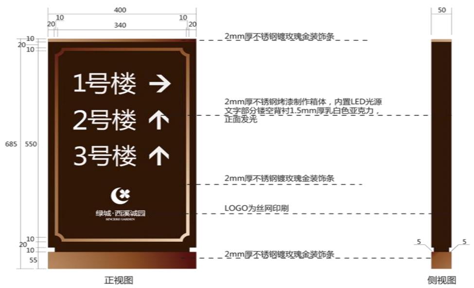 1.西溪诚园为石材幕墙系列二代高局,其悬挂标识的底牌采用了偏暖的咖啡色,不项目色调相融合。