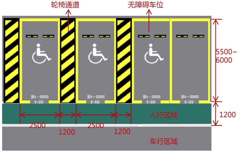 2.停车车位一侧,设宽度大于1.20m的轮椅通道,使乘轮椅者从轮椅通道直接进入人行通道到达建筑入口。若轮椅通道不人行通道地面有高差时,应设宽1.00m的轮椅坡道。