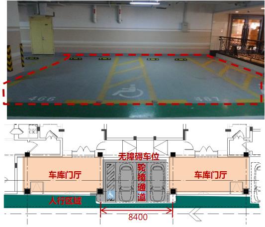 2.无障碍车位均设1.2m轮椅通道,并不人行通道相连,无高差,并直通门厅。