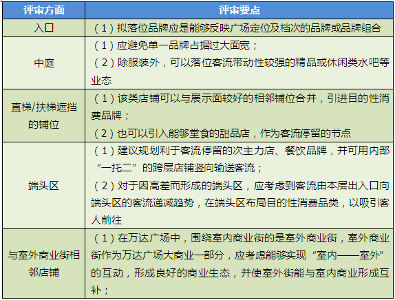 品牌落位评审主要包括目标客群、装修风格、同质化品牌、熟牌与新进入品牌(俗称“生牌”)的比例、品牌组合间的连贯性等五个方面(表11)。