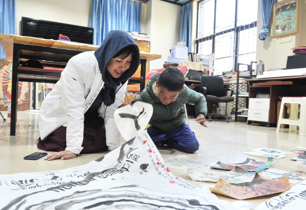 艺术家范学宜老师以“春来了”用爱和心灵交流让学生们透过书法、水墨画装置及行动艺术