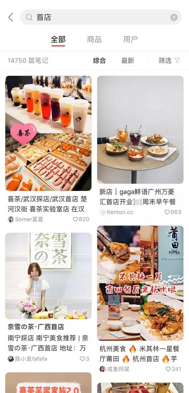 移动互联网时代,微信、微博、小红书、抖音等社交媒体平台加速了首店品牌的传播速度,消费者在ugc社区上记录的“美好生活”成为品牌、购物中心及城市的口碑营销放大器。首店品牌在社交媒体平台上的露出不断增多,截至2019年5月中旬,以“首店”作为关键词进行搜索的小红书笔记共有14750篇。首店的新鲜感、热度、高颜值及唯一性迎合了消费者的社交炫耀心理,打卡拔草、发朋友圈、发抖音、写小红书笔记、回复评论构成消费者自主进行品牌传播的闭环。线上社区用户间的弱联系加速了信息在更广泛群体间的传播,点赞、评论、转发使得ugc数据产生裂变性增长。