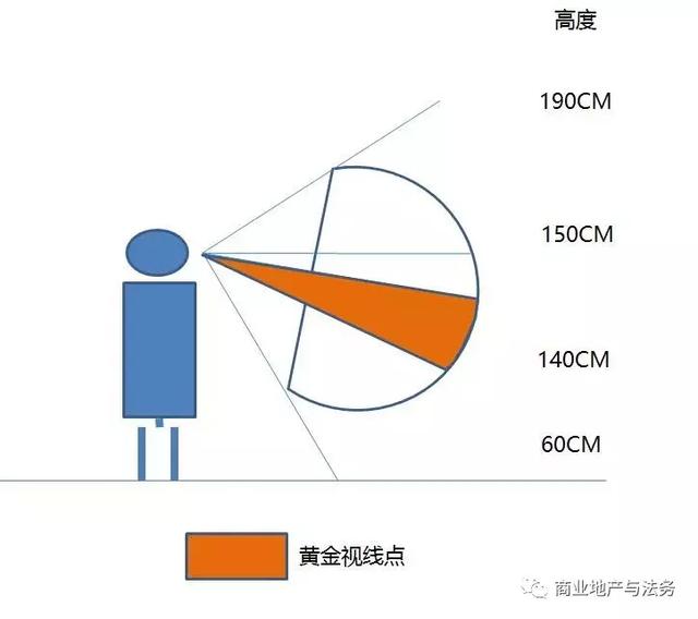1、有效视野:这是指人的头部与眼球处于固定状态时所看到的空间范围。目前我国中国成年男性平均身高为169.7厘米,成年女性平均身高158.6厘米(数据来源:《2014年国民体质监测公报》)。以女性为例,158厘米的视线的平行线位置大概为140厘米左右。所谓黄金陈列高度和位置,是以视线平行线以下20度为中心,偏上10度,偏下20度的位置。